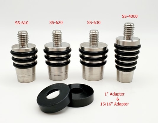 This whiskey sample kit includes the 4 popular stoppers that fit bottles with larger necks than the standard wine or whiskey bottles. The SS-610 fits bottles that are 15/16″ or less diameter: SS-620 fits bottles that are 1″ or less diameter: SS-630 fits bottles that are 1 1/6″ or less diameter. These stoppers are identified with grooves around the base: 610 has 1 groove, 620 has 2 grooves and 630 has 3 grooves. The SS-4000 fits bottles that are 15/16″ or less but have 2 additional o-rings that will fit almost any bottle. You don’t want to use it in a bottle where only one of the bottom 2 o-rings fit as there will be 3 o-rings sticking up out of the bottle. The 2 adapters are for the SS-620 and SS-630 to serve as a guide if you like to do the transition from the wood to the stopper. **note: it’s difficult to say which brands any stopper will fit as each “brand” may have several bottle size offerings. All of Niles stoppers are from FDA 304 18-8 food grade stainless steel and all are made and patented in the USA.